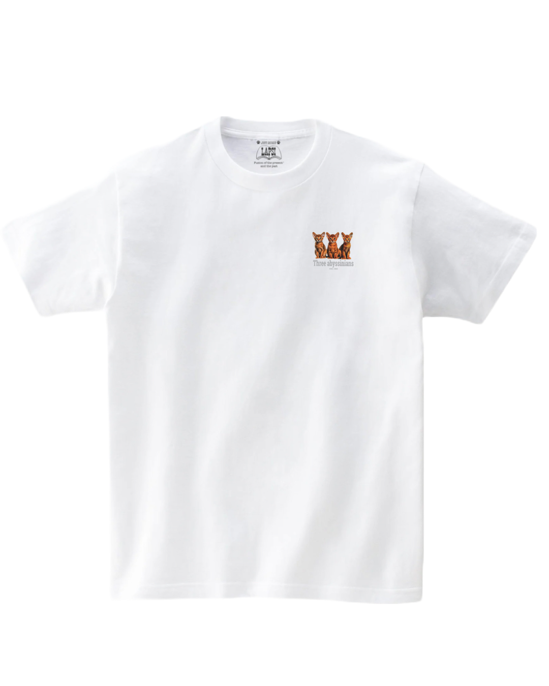 このTシャツは、色のバランスと猫の個性を表情に映し出し、ロゴにはアビシニアンの出生地や生まれ年が込められ、歴史や背景を感じさせます。